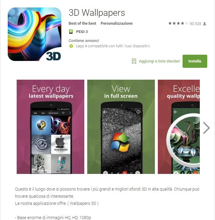 Un’altra ottima app di sfondi con tantissime immagini da scaricare è 3D Wallpapers. Anche in questo caso avrai a disposizione una quantità indefinita di immagini da poter utilizzare immediatamente.
