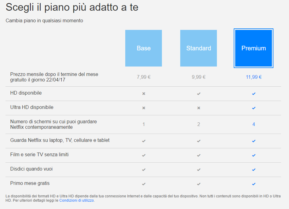 Standard 9,99€: Video in HD. L’abbonamento potrà essere utilizzato da due persone contemporaneamente.
