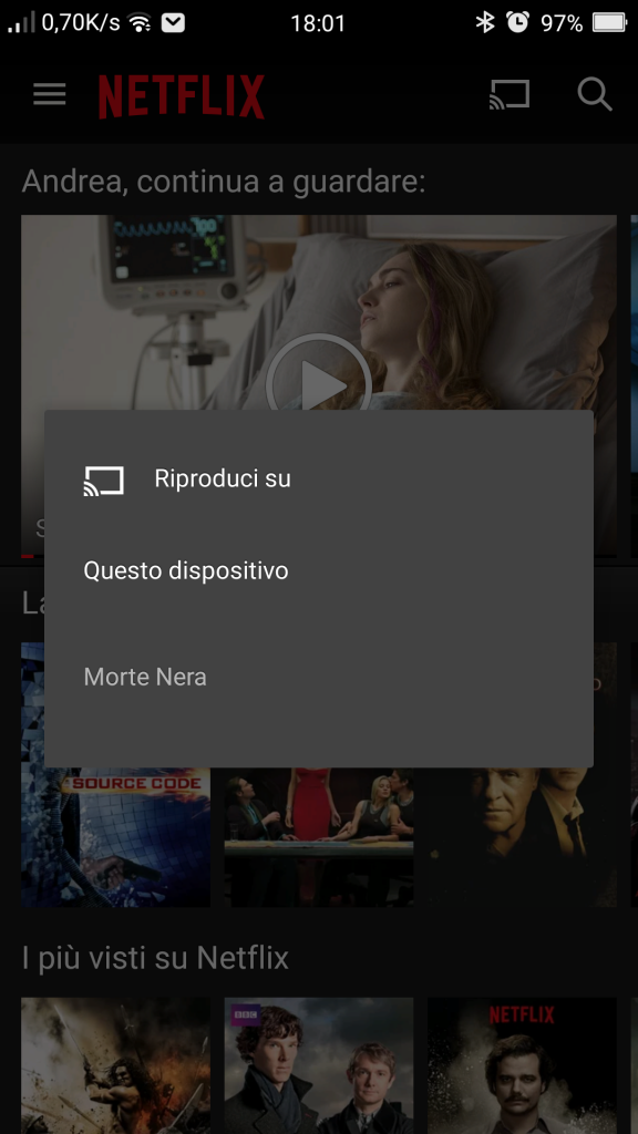 Nello screenshot subito sotto vediamo il popup per la connessione alla Google Chromecast (nel nostro caso si chiama Morte Nera).